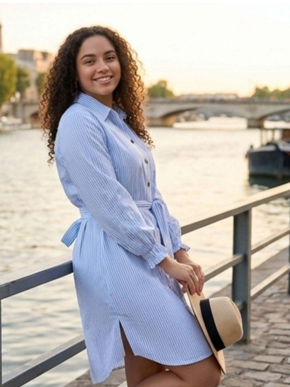 Chemise feminina manga longa ,listrada com cinto, algodão Azul e branco
